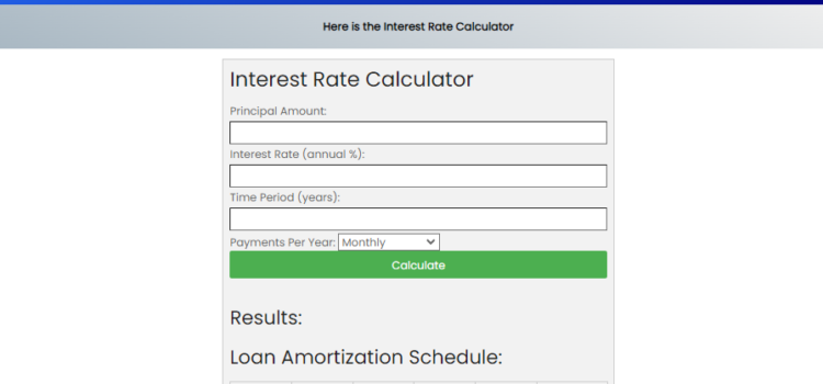 Interest Rate Calculator Here is the Interest Rate Calculator Welcome to the Interest Rate Calculator. Follow these steps to calculate your loan payments and view the loan amortization schedule: Interest Rate Calculator Interest Rate Calculator Principal Amount: Interest Rate (annual %): Time Period (years): Payments Per Year: MonthlyQuarterlySemi-AnnuallyAnnually Calculate Results: Loan Amortization Schedule: Payment # … Continue reading Interest Rate Calculator